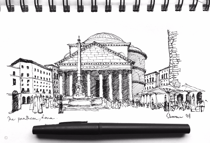 Sketching still life is one thing and sketching real life architectural buildings, spaces, and piazzas is quite another. The vastness and amount of detail in the picture in front of your eyes can be overwhelming. So, you have to make it your goal to capture the scene with the fewest lines possible. Just the most essential elements.